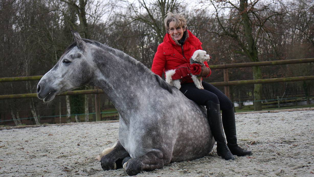 Der Westfalen-Wallach "Berti" hat sich auf Anne Krüger-Degeners Kommando hingelegt, Hündin "Whisky" springt auf seinen Rücken und bringt seinem Frauchen eine Plastikrose, die sie im Maul trägt. | © Anne Neul