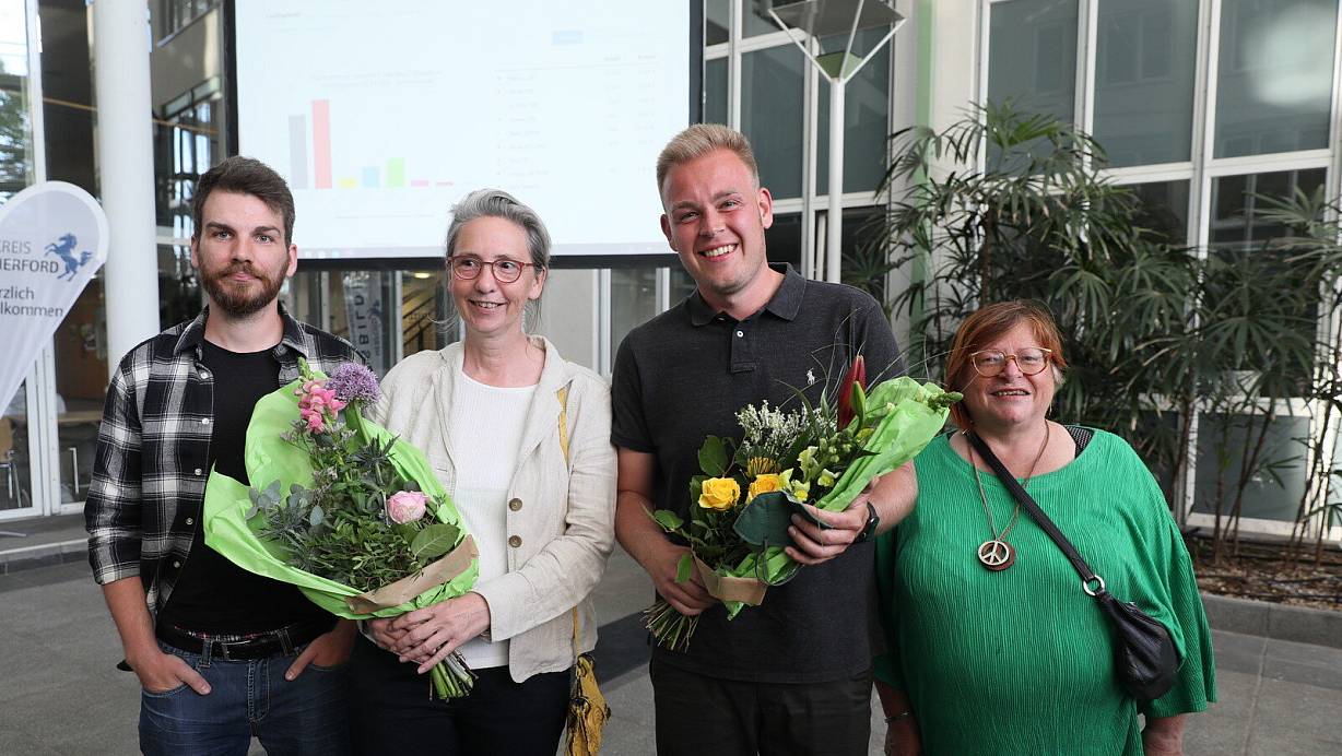 Sasche Steffen und Irmgard Pehle vom Kreisverband gratulieren Andrea Haack und Marvin Reschinsky (Bündnis 90 /Die Grünen) zu ihren Wahlergebnissen. | © Frank-Michael Kiel-Steinkamp