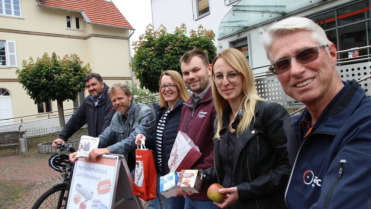 Freuen sich auf das Radlerfrühstück: Carsten Witt (Leiter Verkkehrsplanung, v.l.), Meiko Haselhorst (NW), Miriam Dröge (Stadtmarketing Bünde), Christoph Erdbrügger (Bäckerei Erdbrügger), Sandy Metzger (Edeka Metzger) und Rolf Overlack (ADFC). | © Jan-Henrik Gerdener