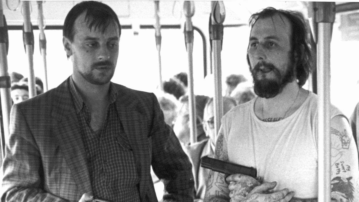 Die bewaffneten Geiselnehmer Dieter Degowski (l) und Hans-Jürgen Rösner stehen am 17.8.1988 in dem in Bremen gekaperten Linienbus. Die Geiselnehmer hatten am 16.08.1988 in Gladbeck-Rentfort eine Bank überfallen und zwei Geiseln genommen. | © Hartmut Reeh/DPA