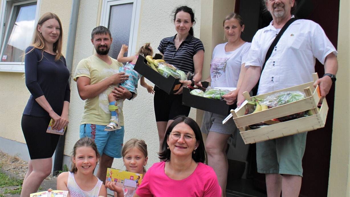 Dirk Kaiser vom Verein Brückenschlag Ukraine überreichte den Geflüchteten aus der Ukraine am Dienstag mit Obst, Freibadkarten und Einkaufsgutscheinen Wilkommenspräsente.
