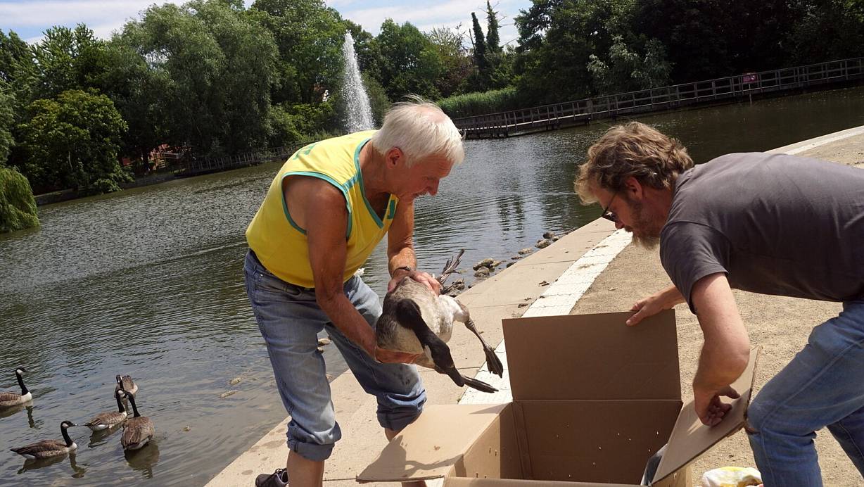 Und ab in die Kiste: Aldo Robijn kommt mit der Gans aus dem Wasser, NW-Redakteur Meiko Haselhorst steht schon mit dem Transportbehälter parat. | © Niklas Krämer