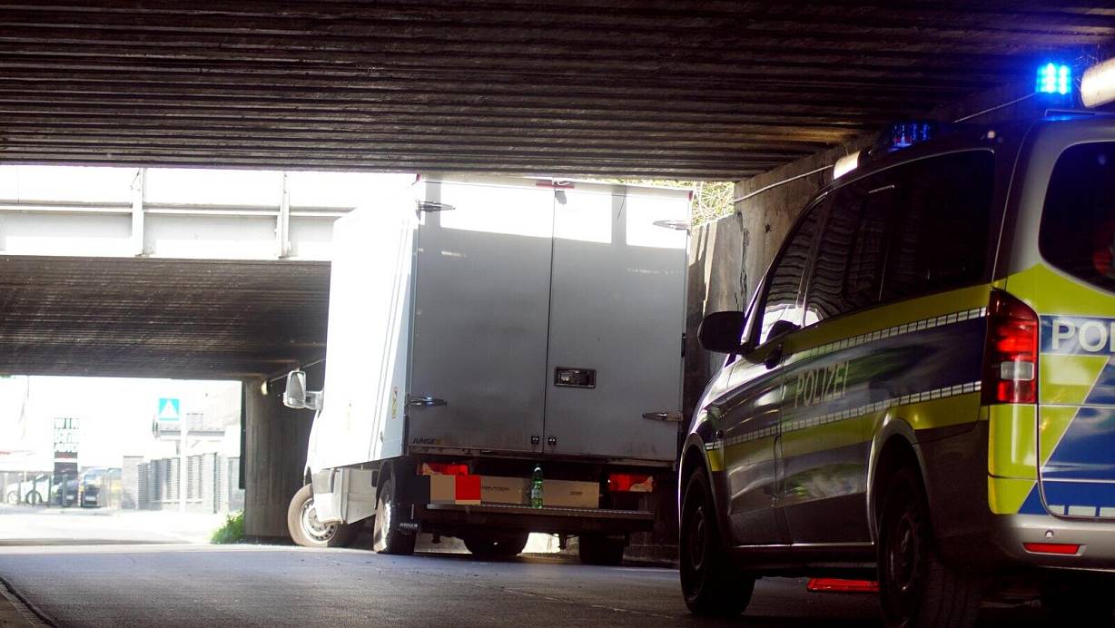 Ein Transporter steckt unter der Brücke Gerhart-Hauptmann-Straße fest. Die Polizei regelt in diesem Fall den Straßenverkehr. | © Niklas Krämer