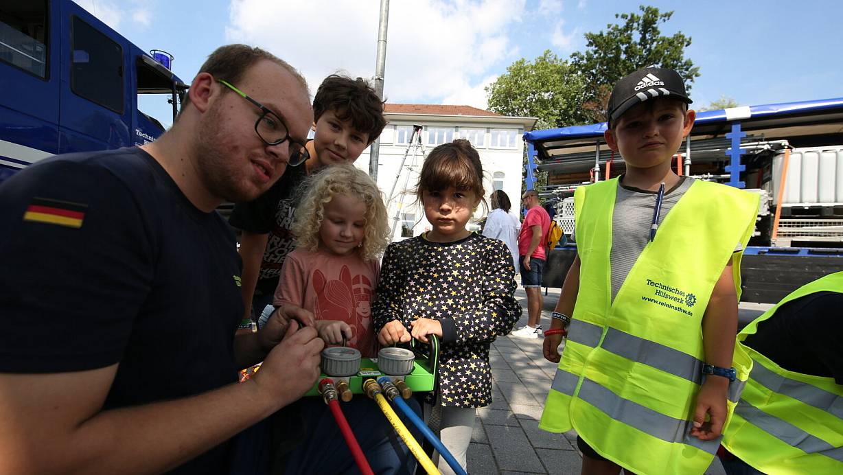 THW-Mann Daniel Hills hilft Johanna (4) und Alva (4) beim Steuern von aufblasbaren Hebekissen. Mika (6, rechts) und Finn (12, dahinter) sind danach dran. | © Gerald Dunkel
