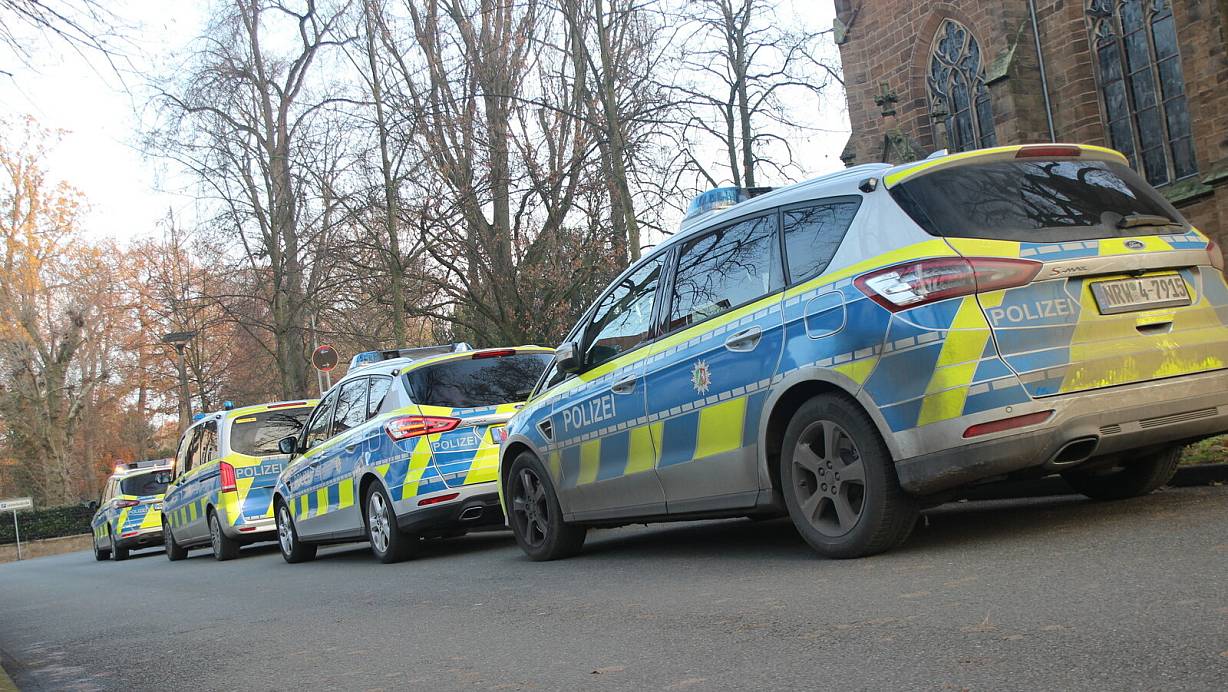 Vier Einsatzwagen der Polizei parken auf einer Zufahrt zum Parkplatz der Pauluskirche in Bünde. | © Jan-Henrik Gerdener
