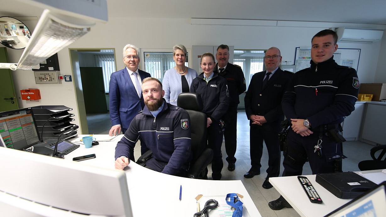 Weihnachtsbesuch bei der Polizei in Bünde: Landrat Jürgen Müller (stehend von links), Bürgermeisterin Susanne Rutenkröger, Theresa Klapper, Bernd Kröger, Uwe Köhler und Tim Wippermann. Am Schreibtisch der Wache sitzt Johannes Niederführ. Foto: Gerald Dunkel | © Gerald Dunkel