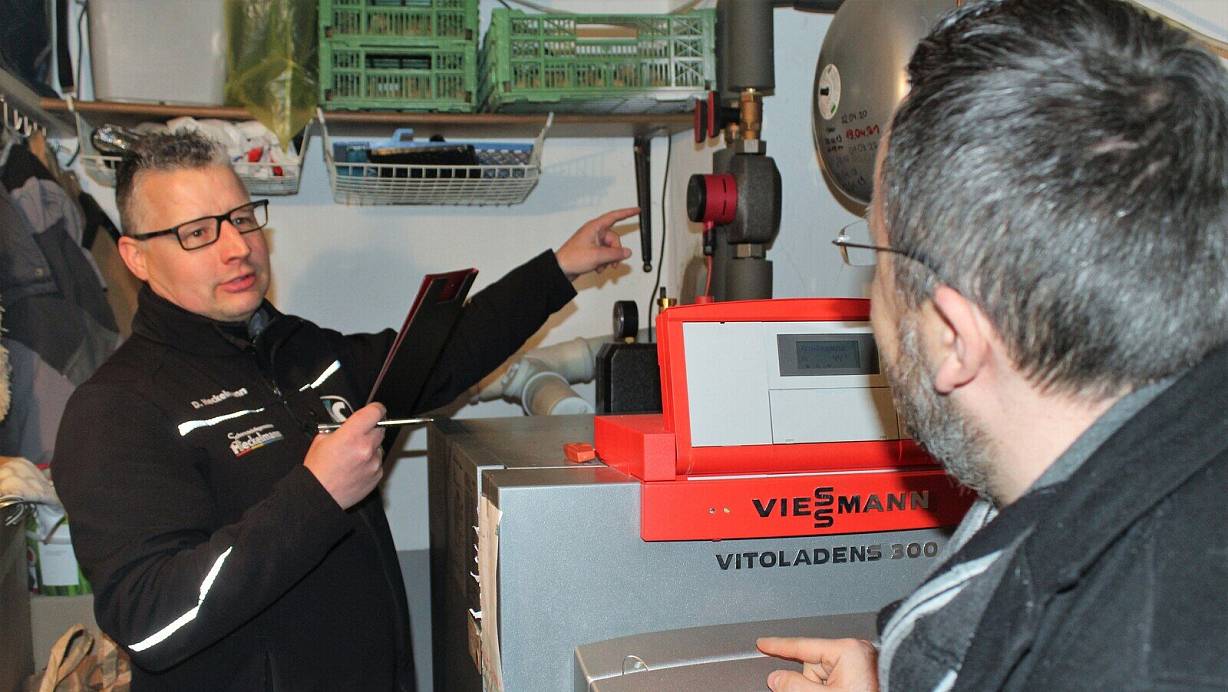 Schornsteinfeger und Energieeffizienz-Experte Daniel Heckelmann sieht sich die Heizung im Elternhaus von Damian Bury an. | © Anastasia von Fugler