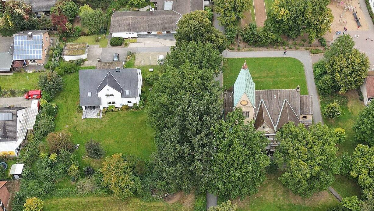 Auf der Rasenfläche links unterhalb der Kirche in Dünne soll die neue Kita des Kirchenkreises entstehen. Foto: Gerald Dunkel | © Gerald Dunkel