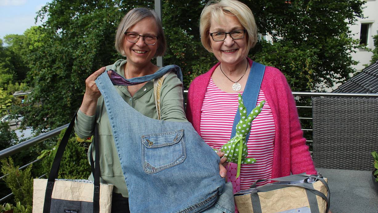 Antja Adam (v.l.) und Barbara Firus nähen sich ihre Handtaschen selbst. | © Anastasia von Fugler