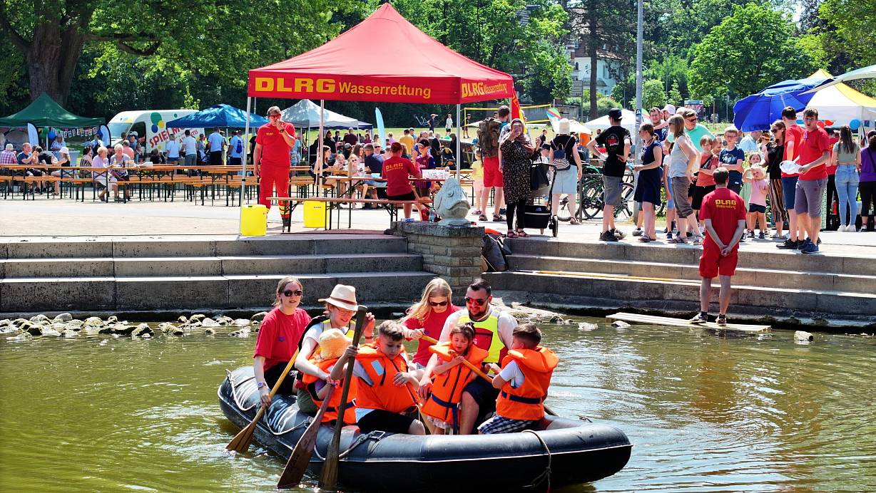 Die DLRG schipperte mit den jungen Gästen und ihren Eltern auf dem auf dem Teich im Steinmeisterpark einmal um die Insel. | © Gerald Dunkel