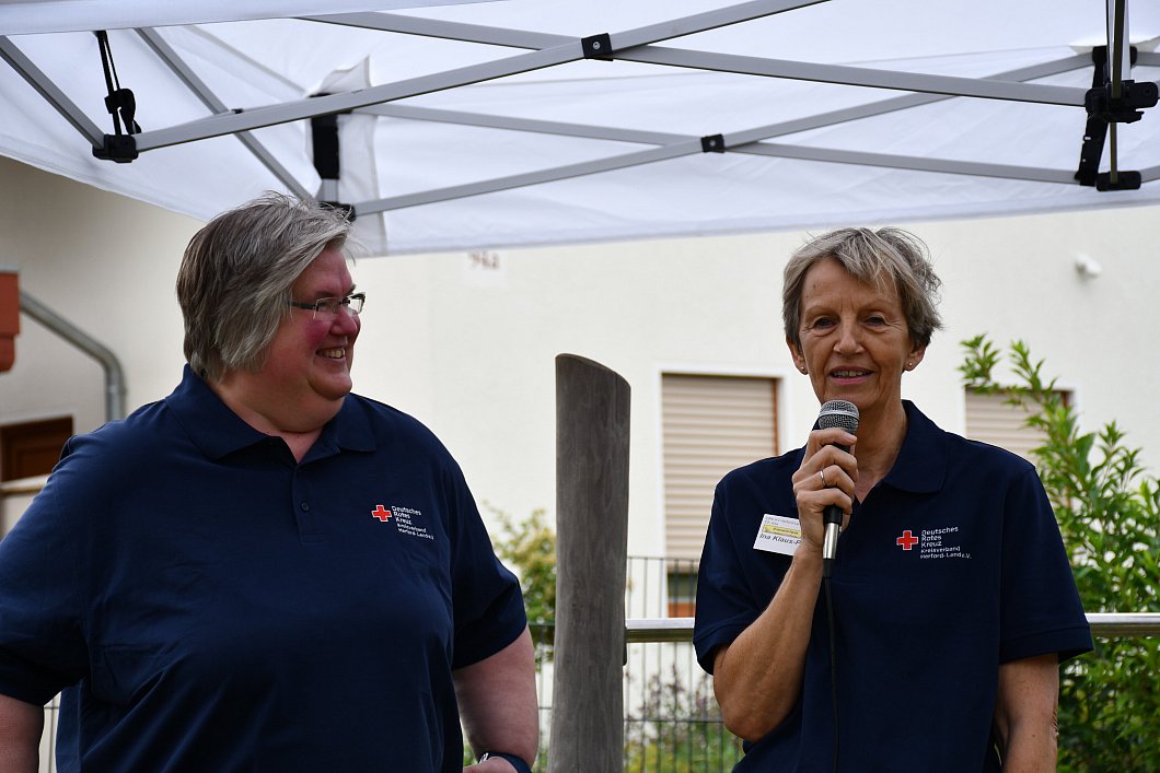 Bünde. „Liebe Ina, du Frau Klaus, du siehst heute anders aus. Und du gehst zum letzten Mal durch unsere Tür.“ Das selbstgeschriebene Lied, mit dem Kita-Leiterin Ina Klaus-Petrach in den Ruhestand verabschiedet wurde, trieb so manchem Zuhörer die Tränen in die Augen. 26 Jahre lang war die gelernte Erzieherin Leitung der DRK-Kita Kieselstein in Bünde, die am 16. Juni 1997 die Türen für die ersten Kinder öffnete. In dieser Zeit hat sich ein Netzwerk aus Kolleginnen, Eltern, Kindern und Ehemaligen gebildet, die sich feierlich verabschieden wollten. Der passende Moment war das Sommerfest der Kita, das am Wochenende stattfand.