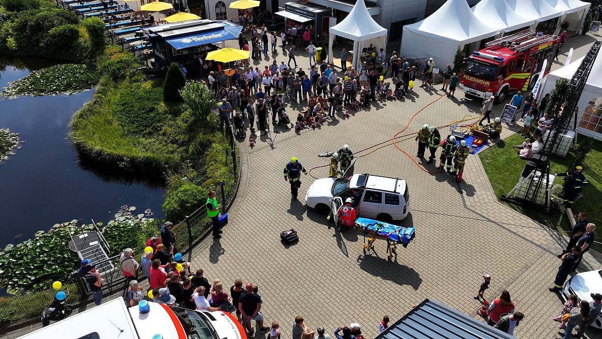 Das Angebot auf dem Gelände der Energie- und Wasserversorgung Bünde lockte über das Wochenende mehr als zehntausend Besucher. Hier wird präsentiert, wie ein Unfallopfer aus einem Auto befreit wird. | © Gerald Dunkel