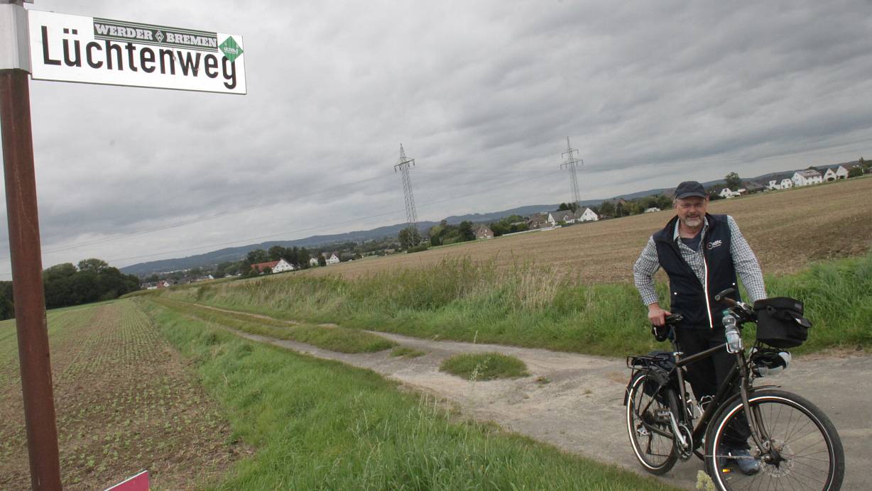 Uwe Diekmann vom ADFC an einem von zwei Feldweg-Abschnitten, die er für Radfahrer gerne ein wenig aufpeppen ließe - als Teilstück einer "interkommunalen Radwegeverbindung zwischen Enger und Bünde". Der Aufkleber überm Straßennamen stammt von einer anderen Interessengruppe. | © Meiko Haselhorst