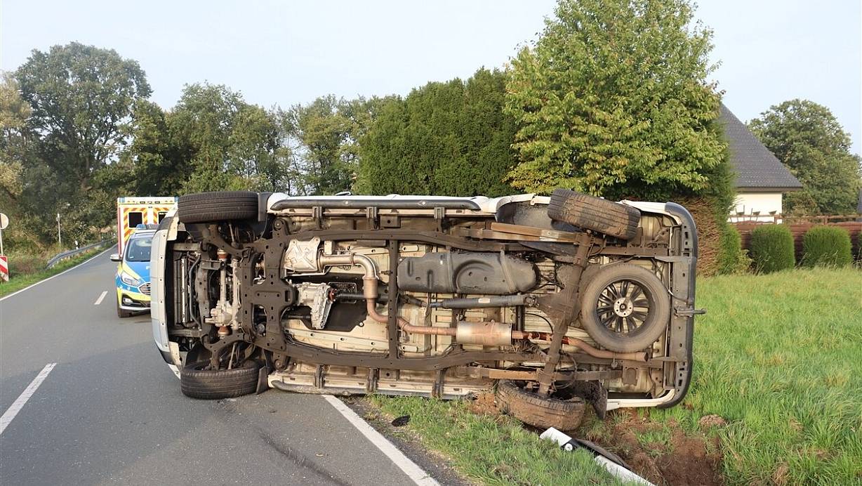 Nach dem Zusammenstoß in Bünde landet eines der Fahrzeuge auf der Seite. | © Polizei Herford