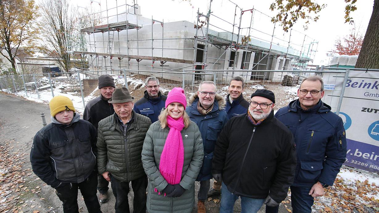 Zufriedene Gesichter in eisiger Kälte. Kita-Leiterin Nicole Zörner mit Superintendent Olaf Reinmuth (rechts dahinter) sowie den Vertretern des Architekturbüros Bäunker und Cawalla und der Zimmerei Gerhard Kienker (links). Der Rohbau dahinter soll in den kommenden acht Monaten bezugsfertig werden. | © Gerald Dunkel