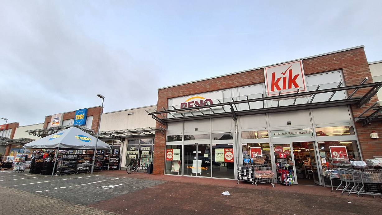 Noch immer stehen die alten Verkaufsregale in der früheren Reno-Filiale. Das Werbeschild hängt noch, ebenso sind die Rabatt-Hinweise noch im Schaufenster angebracht. | © Peter Heidbrink