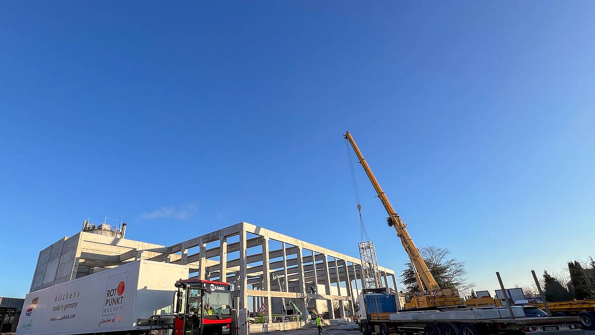 Investition in die Zukunftsfähigkeit: Aktuell entsteht am Firmensitz von Rotpunkt Küchen in Bünde-Ahle ein neues Gebäude für Lager und Logistik. Das schafft auch Platz in der bestehenden Fertigung für neue Maschinen zur weiteren Automatisierung der Produktion und bei Bedarf für weitere Kapazitäten. | © Rotpunkt Küchen