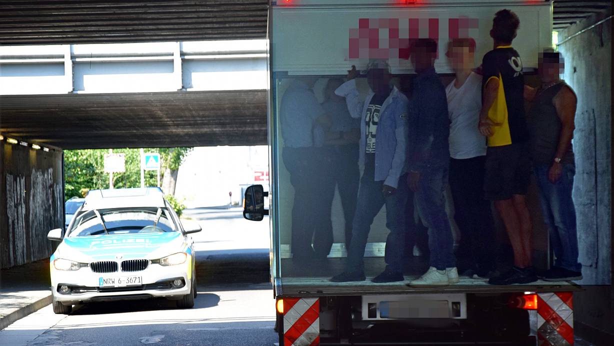 Im Jahr 2018 versuchten mehrere Personen mit ihrem Gewicht, den festsitzenden Lkw tiefer zu legen. | © Polizei Kreis Herford