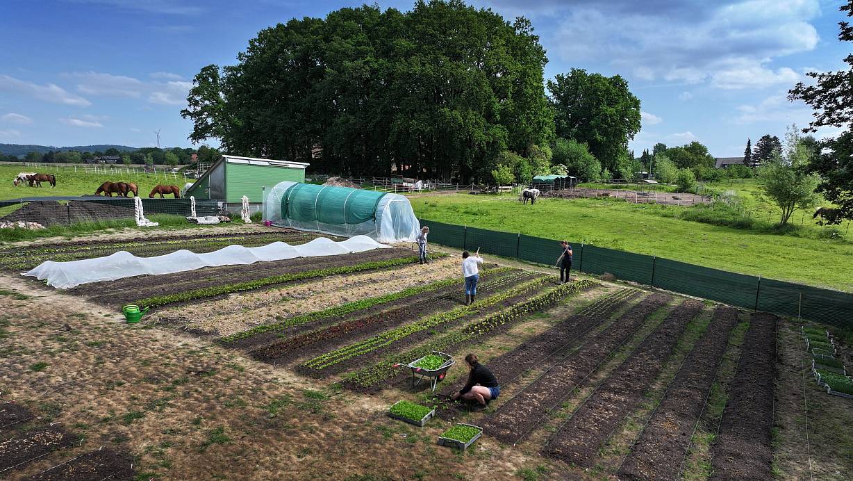 Der Gemüsegarten ist aktuell noch 500 Quadratmeter groß und soll auf das Vierfache wachsen. Hier sind Hofchefin Sandra Kreft (Mitte), ihre Tochter Lilli Kreft (vorn), Leandra Wiemann (rechts hinten) und Kira Hanna dabei, das Gemüse zu pflegen und neue Pflanzen zu setzen. Fotos: Gerald Dunkel | © Gerald Dunkel