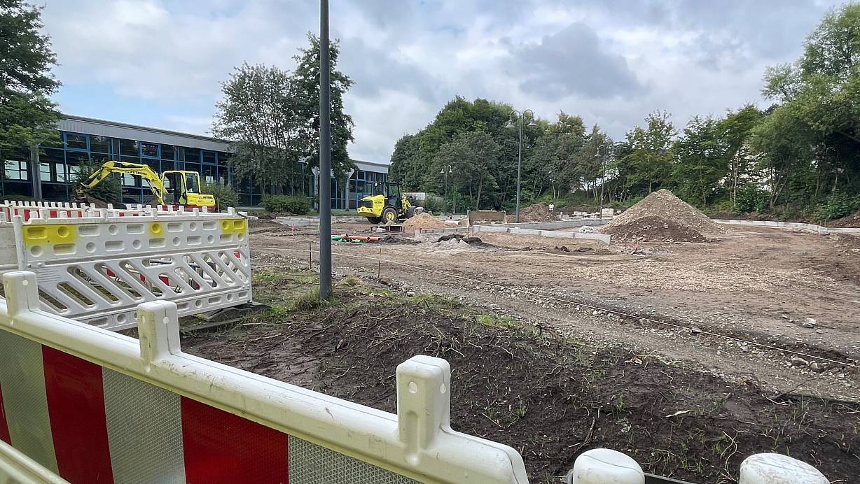 Der Parkplatz an der Siegfried-Moning-Sporthalle neben dem Freiherr-vom-Stein-Gymnasium Bünde wird zurzeit erneuert. Einige der Randsteine sind bereits zu sehen. | © Shannon-Lee Bendig