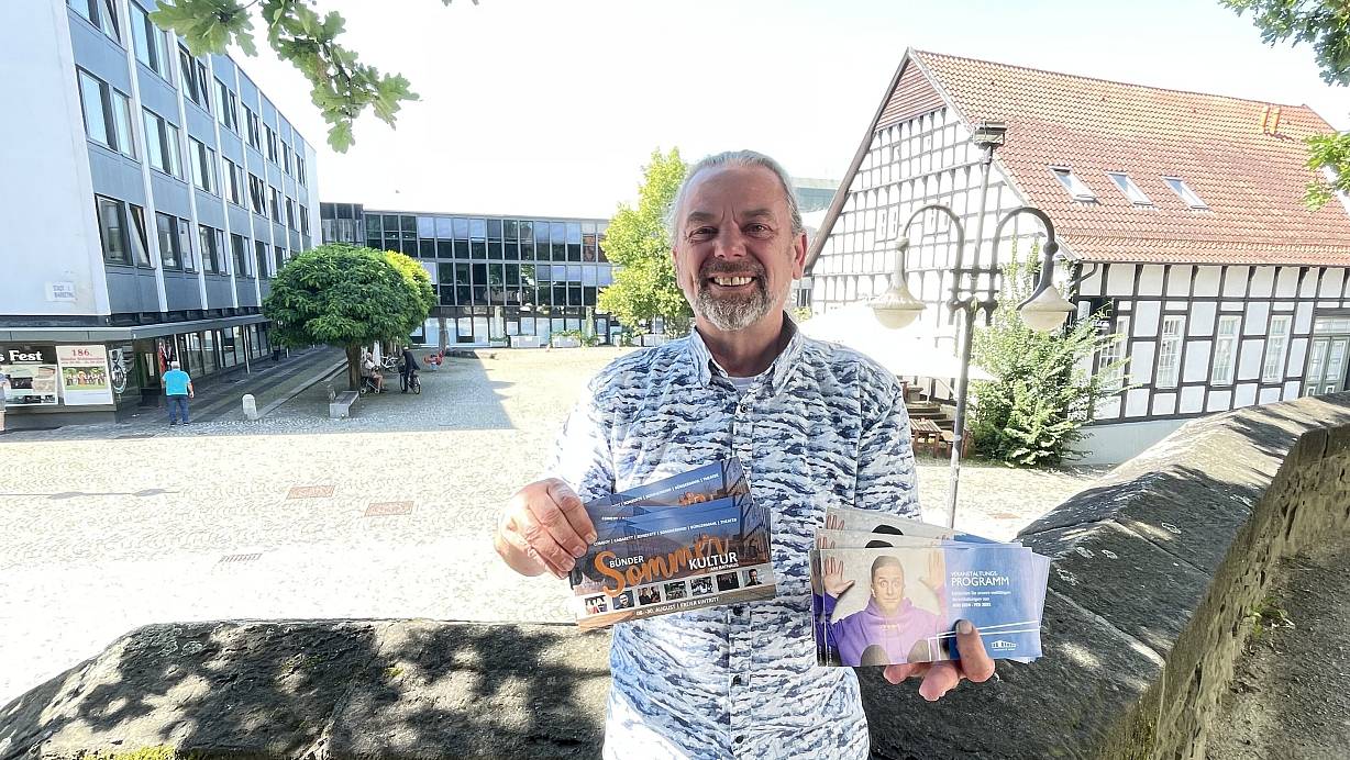 Am Donnerstagabend startet die Bünder Sommerkultur wieder auf dem Rathausplatz im Hintergrund. Ansonsten hält Dirk Kaiser das prall gefüllte Veranstaltungsprogramm für Universum und Stadtgarten bis Februar 2025 in der Hand. | © Natalie Gottwald