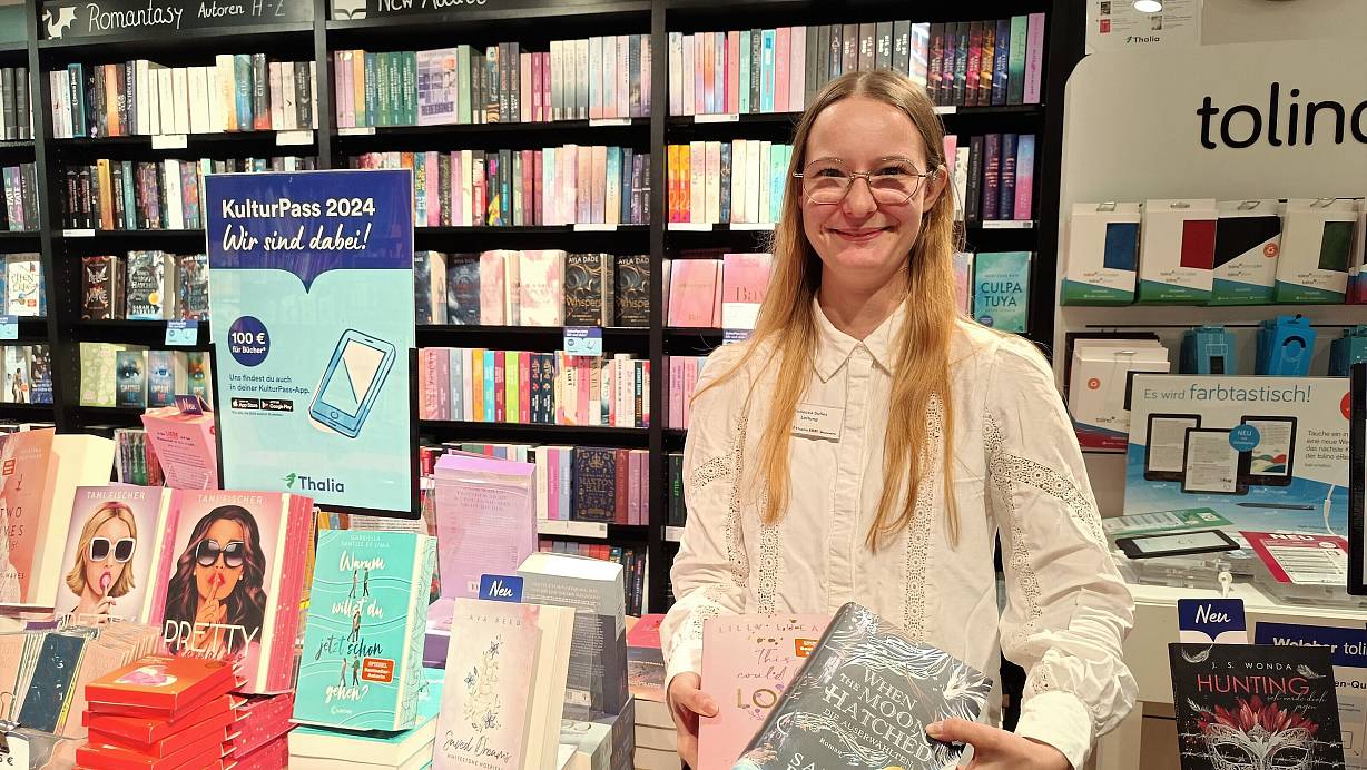 Rebecca Sulies leitet die Mayersche Buchhandlung in Bünde. Das Kulturpass-Schild steht nicht ohne Grund vor den Regalen mit den New-Adult-Titeln. | © Sven Hauhart