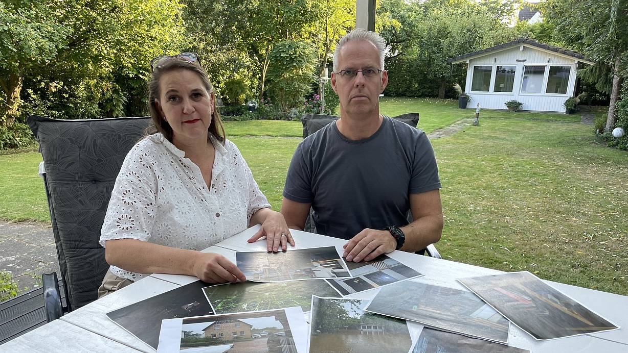 Nicole und Christoph Hellmeier wohnen seit 18 Jahren in ihrem Haus in Hunnebrock. Seitdem stand ihr Grundstück zweimal unter Wasser. Bilder aus 2014 und 2021 erinnern sie bis heute daran. | © Shannon-Lee Bendig