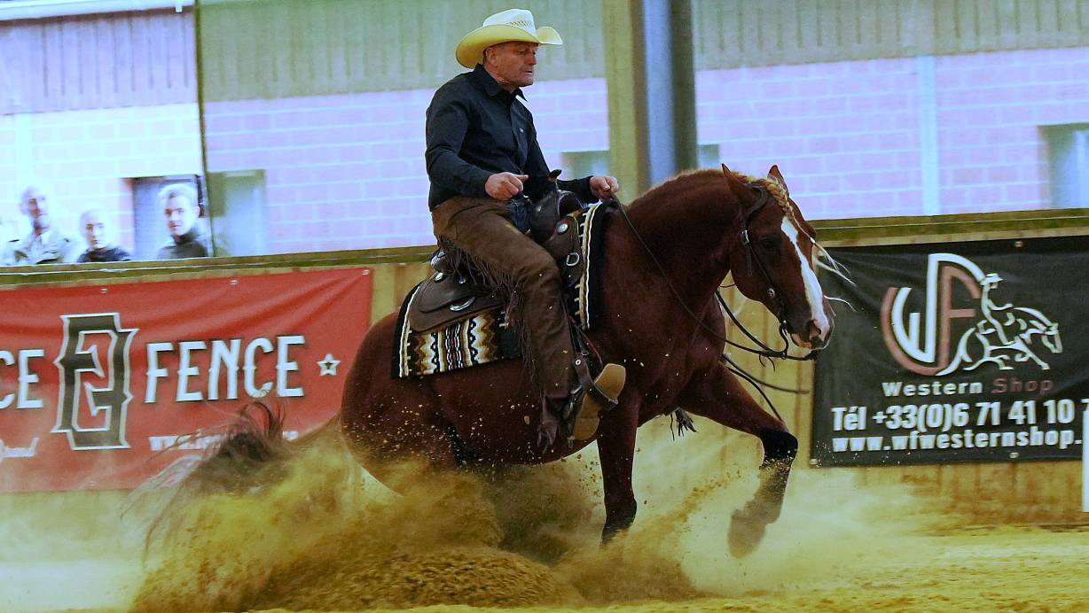 Stefan Glass aus Hiddenhausen reitet und trainiert auf der Anlage der Familie Bausch. Er ist einer der Favoriten bei dem Reining-Wettbewerb und legt hier einen spektakulären „Sliding Stop“ aus vollem Galopp mit seinem Pferd „Smart Walla Whiz“ hin. | © Gerald Dunkel