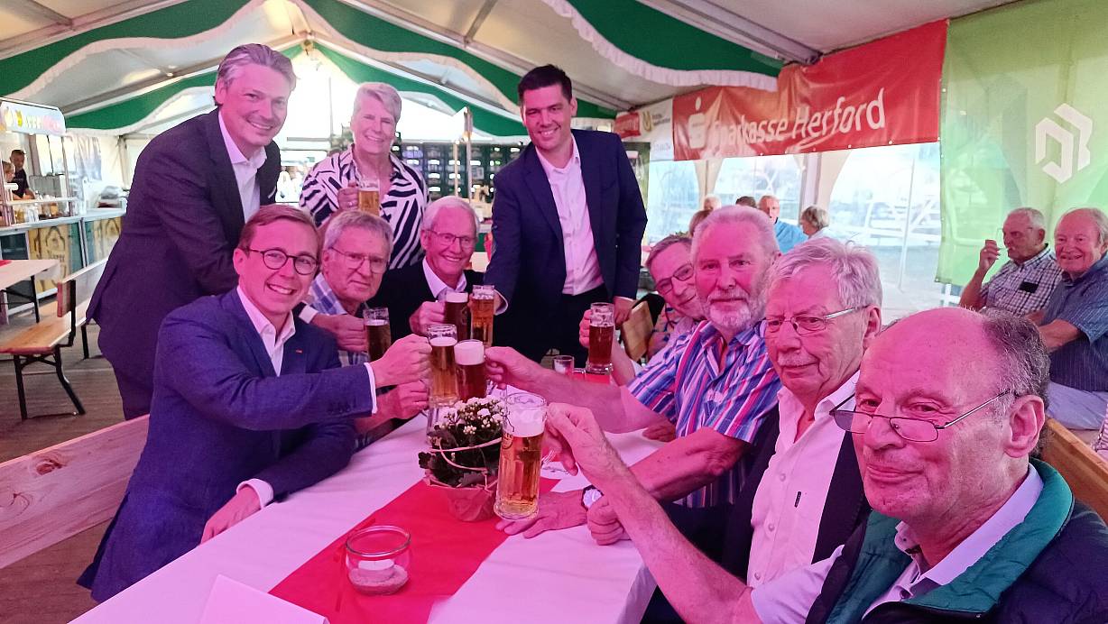 Philipp Amthor (sitzend v.l.) stößt mit Horst Wibbeler, Reinhard Linke, Karl-Heinz Uthoff, Horst Droese, Jürgen Büscher und Friedhelm Eickmann an. Die lokale Politprominenz prostet mit. | © Sven Hauhart