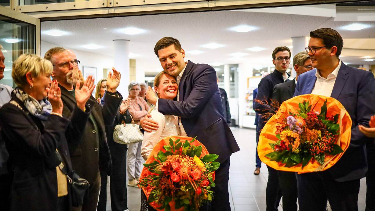 Mirco Schmidt feiert seinen Wahlsieg als neuer Landrat des Kreises Herford mit seiner Frau Stephanie. | © Daniel Salmon