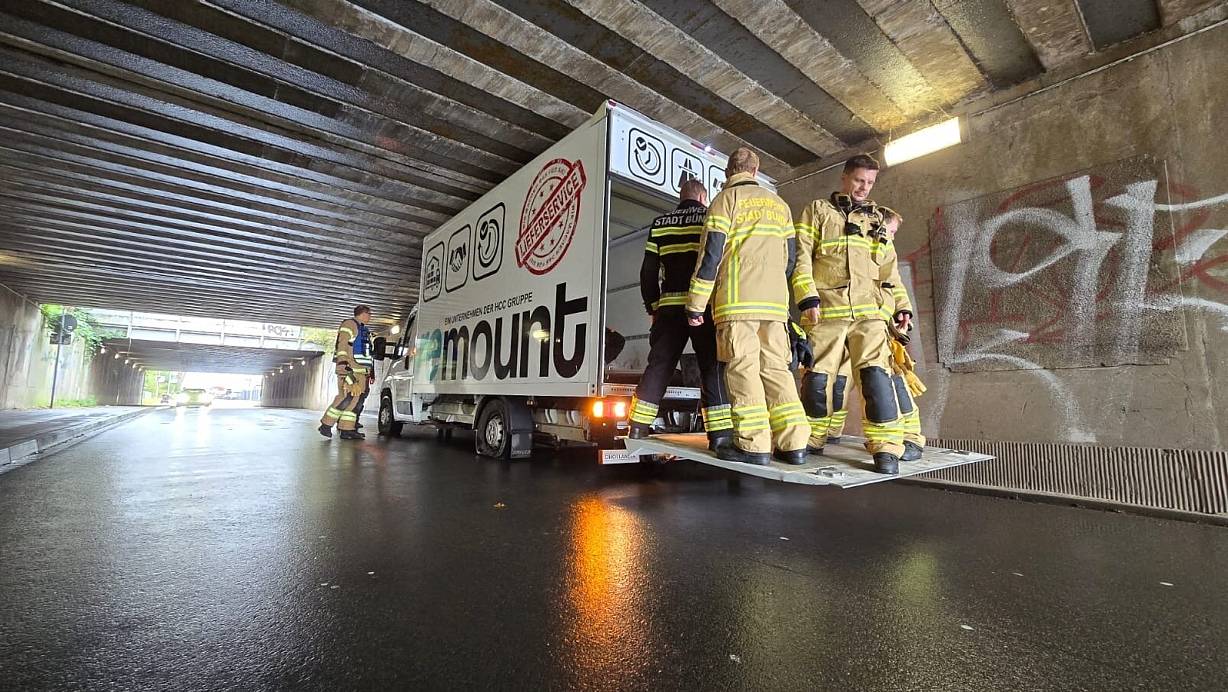Zum wiederholten Male wird die Bahnunterführung an der Gerhart-Hauptmann-Straße einem Laster zum Verhängnis. Die Feuerwehr befreit das feststeckende Gefährt.