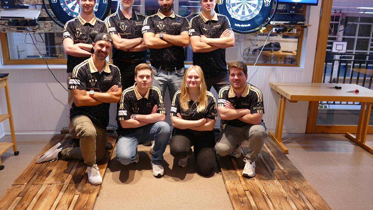 Möchten das Dart-Spiel beim BTW Bünde nach vorne bringen: Luis Lücke (oben v.l.), Marcel Wißkamp, Gökhan Colban und André Brandmeier. Unten v.l.: Patrick Freiheit, Jonathan Specht, Lea Forman und Calvin Hanneke. | © Thorsten Mailänder