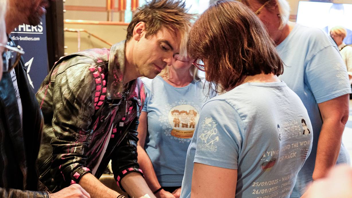 Chris Ehrlich unterschreibt nach der Show auf den T-Shirts der weitgereisten Fanclub-Mitglieder aus NRW. | © Philipp Kaufmann