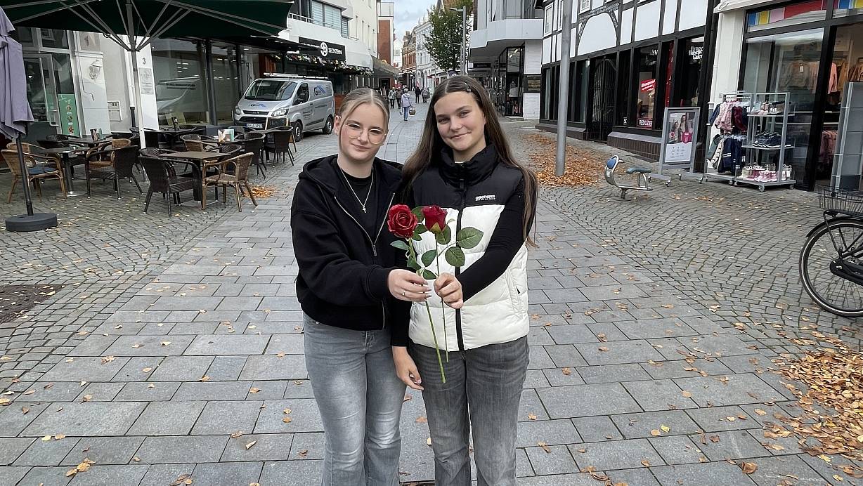 Bella und Neila verschenken Blumen an Fremde in der Innenstadt – einfach, um ihnen eine Freude zu machen. Was sie dazu bewegt und wie die Menschen reagieren.