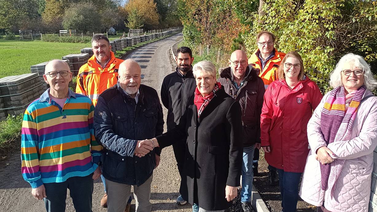 Ulrich Tilly von der Bezirksregierung (v.l.), Carsten Witt (Stadt Bünde), Kirchlengerns Bürgermeister Rüdiger Meier, Marcel Schwentker (Tiefbau Stohlmann), Bündes Bürgermeisterin Susanne Rutenkröger, Michael Doemke (Gemeinde Kirchlengern), André Rumenic, Annette Kühn und Andrea Brückner (alle Stadt Bünde) freuen sich über den interkommunalen Ausbau des Teilstücks vom Else-Werre-Radweg. | © Sven Hauhart