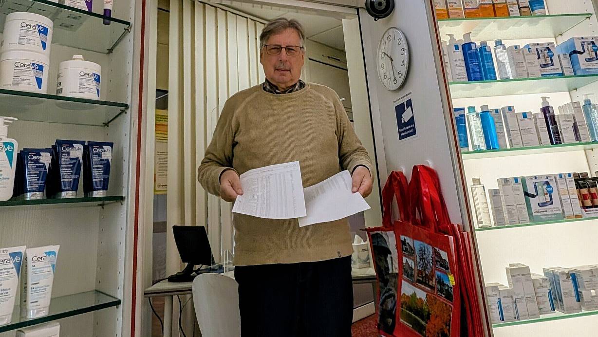 Apotheker Reinhard Rokitta steht vor seinem Beratungszimmer mit zwei Zetteln voller nicht verfügbarer Medikamente. Ersatz bekommt er, aber der Preis ist hoch. | © Marek Schnelle