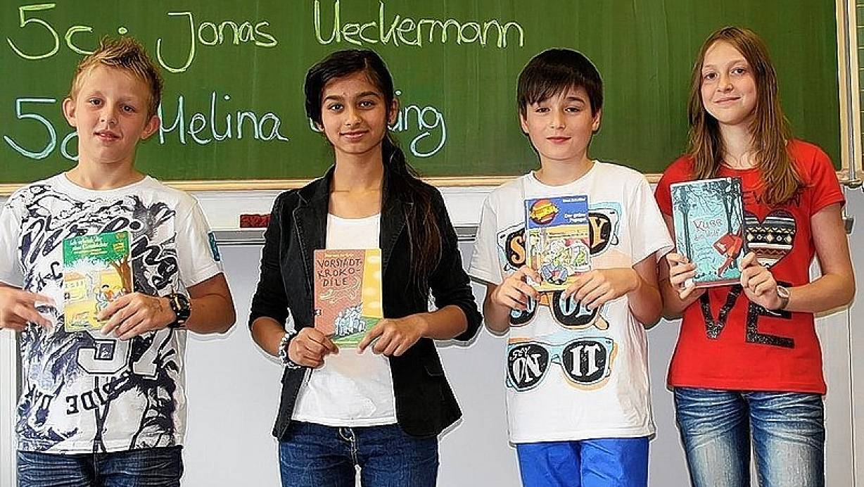 Hier galt es, zunächst einen etwa dreiminütigen Text aus einem selbst gewählten Buch zu lesen. Die Klasse 5a (Deutschlehrerin Birgit Finkemeier) schickte Dominik Stratmann ins Rennen, der einen Ausschnitt aus "Wir vom Brunnenplatz" von Christine Fehér vorstellte. Bukurije Zeka vertrat die Klasse 5b (Deutschlehrerin Henrike Uhrmacher) und las aus dem Buch "Vorstadtkrokodile" von Max von der Grün. Aus der Klasse 5c (Deutschlehrerin Svenja Müller) stellte Jonas Ueckermann eine Passage aus dem Buch "Kommissar Kugelblitz und der grüne Papagei" von Ursula Scheffler vor. Melina Ehrling aus der Klasse 5d (Deutschlehrerin Britta Beckmann) wählte zum Vorlesen das Buch "Küss den Wolf" von Gabriella Engelmann aus. Im Anschluss an die Kür mussten die Teilnehmer dann einen Fremdtext bewältigen, der aus dem Buch "Kim Krabbenherz" von Sabine Both stammte. Die fachkundige Jury bewertete in jedem Durchgang die Lesetechnik, die Textgestaltung und das Textverständnis mit maximal 5 Punkten.