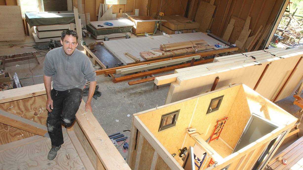 Module: Marco Lepper, Chef von Holzbau Lepper in Enger, will sich vergrößern. Sein Betrieb ist flexibel. Hier betrachtet er ein ganz besonderes Häuschen: Ein WC-Modul, das demnächst im Golfclub Ravensberger Land stehen wird. | © Andreas Sundermeier