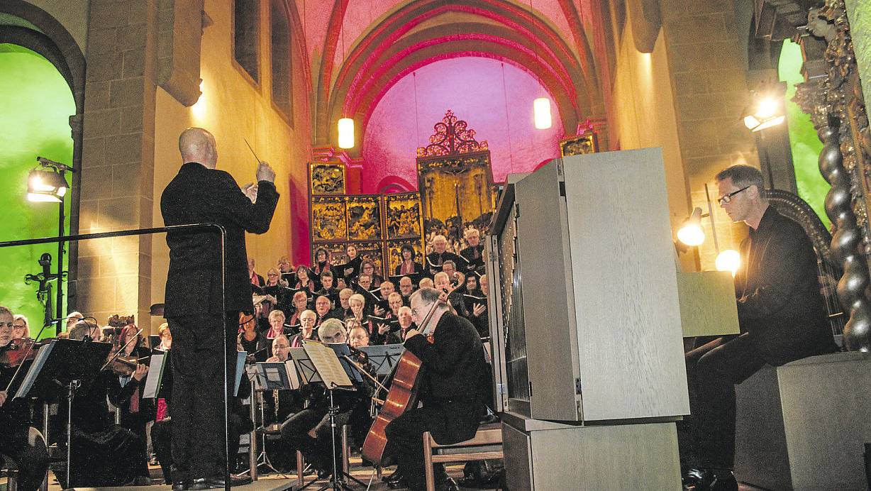 Beeindruckend war nicht nur dieser Organisationsaufwand, sondern auch die Tatsache, dass der Chor die Sopranstimmen aus den eigenen Reihen mit Susanne Fröhlke, Carina Andersohn, Brigitte Diekmann und Frauke Altvater hervorragend besetzen konnte. Und auch die Feinabstimmung zwischen Solisten, Instrumentalisten und dem Chor lief dank Konzertleiter Hans-Martin Kiefer reibungslos, obwohl alle in dieser großen Besetzung das erste Mal erst am Samstagvormittag geprobt hatten. Perfekt abgerundet wurde dieser Gesamteindruck von der bunt angestrahlten Stiftskirche, die den passenden Rahmen für das Konzert schuf. Ausgezahlt hat sich das große Engagement, das Sängerinnen und Sänger in diese Veranstaltung investiert haben. Seit Anfang des Jahres haben sie für das Konzert geprobt. Die gut 360 Zuhörer bedankten sich mit Applaus und Standing Ovations. „Das war das schönste Konzert, das ich jemals von dem Widukind-Chor gehört habe“, sagte Ehrenchorleiter Manfred Altvater begeistert. „Es ist einfach erstaunlich, dass die Sopranistinnen keine professionell ausgebildeten Sängerinnen sind. Das ganze Konzert war eine außergewöhnliche Leistung.“