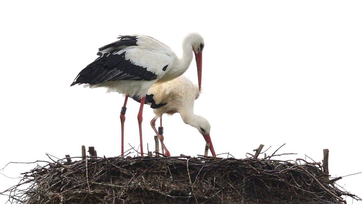 Richten sich in ihrer luftigen Einzimmer-Wohnung ein: Die beiden Störche, die schon 2017 und 2018 im Enger Bruch brüteten, sammeln fleißig Material, um ihr Nest zu renovieren. | © Lietzow Naturfotografie