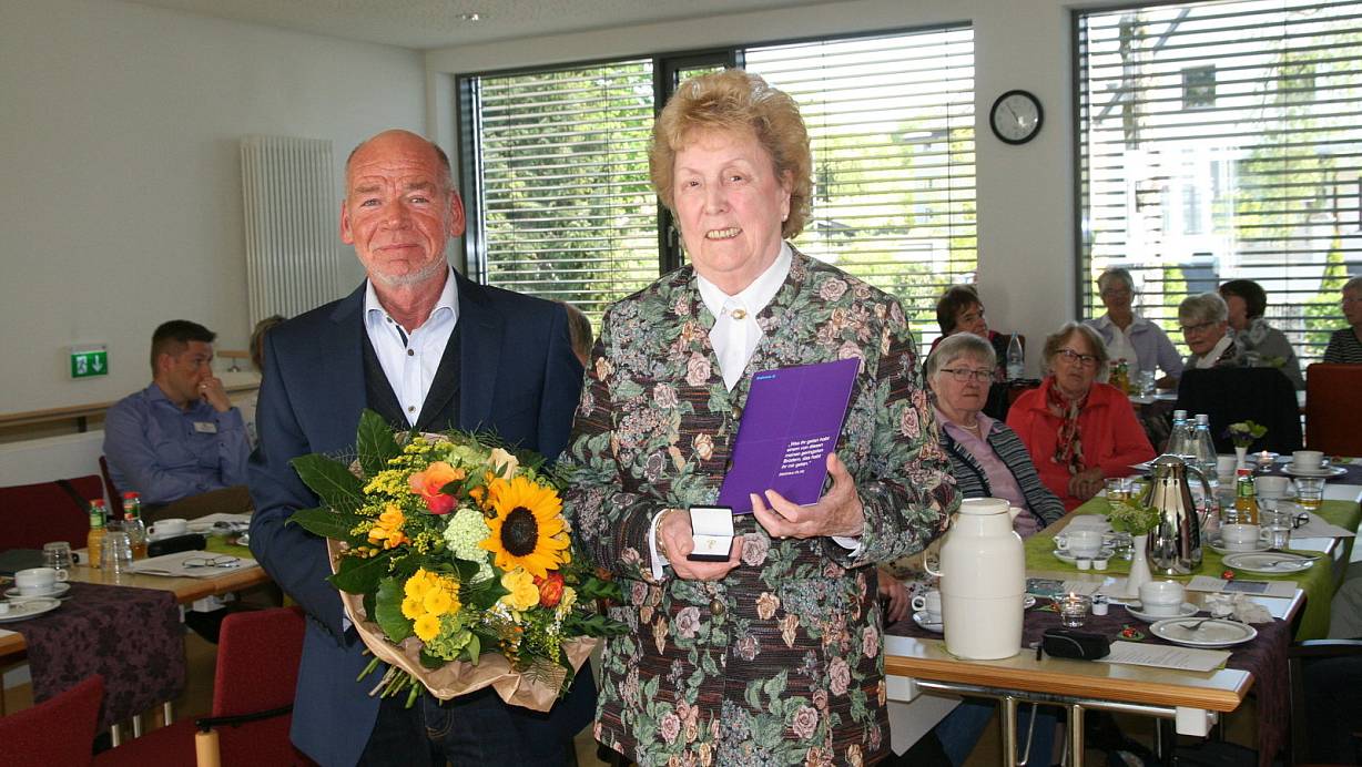 Michael Schoenfeld, Geschäftsführer der Diakoniestation, überreichte Monika Middelmann das Kronenkreuz und eine Urkunde. "Sie schenkten den Menschen in der Geriatrie Zeit, also Ihre ganz persönliche Lebenszeit", hob er während der Feierstunde anerkennend hervor. "Sie waren bei Menschen, die sonst gar keinen oder nur wenig Besuch erhielten. Sie boten den Patienten erlebte Seelsorge und die Möglichkeit, an den Gottesdiensten im Haus teilzunehmen", so Schoenfeld weiter. "Sie hatten Zeit für zahllose Menschen - das war großartig."