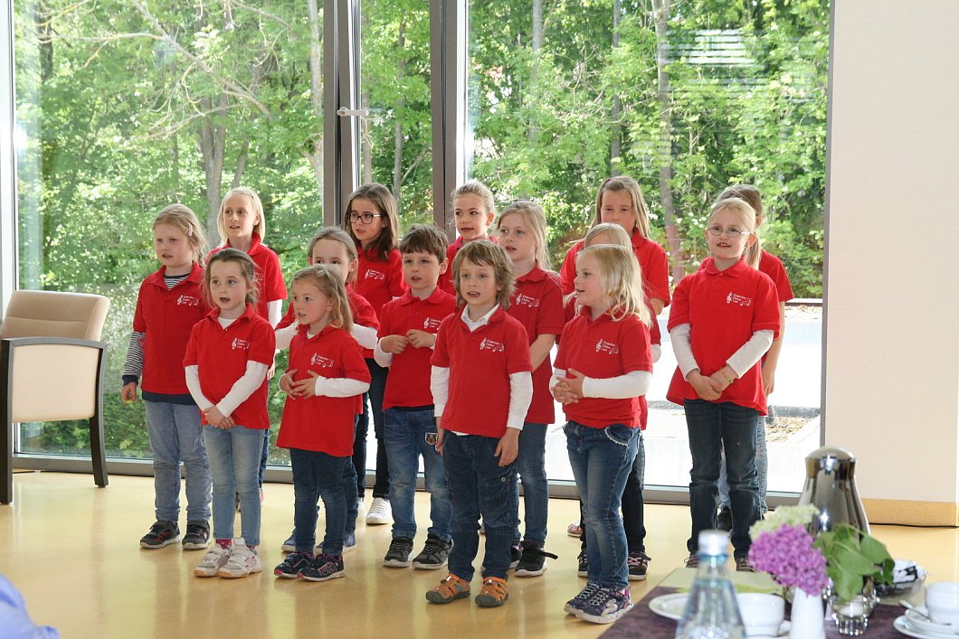 Um dieser Feierstunde beizuwohnen, waren auch 15 "Grüne Damen" vom Bünder Lukas-Krankenhaus in die Geriatrie nach Enger gekommen. Zudem war auch Engers Bürgermeister Thomas Meyer bei der Ehrung dabei. Und der Kinderchor "Kleines Lied" unter Leitung von Martina Böske trug mit einigen schwungvollen Liedern zur musikalischen Gestaltung des Nachmittags bei. Die 16 Kinder besangen den Frühling und starteten auch eine musikalische Reise ins Weltall.