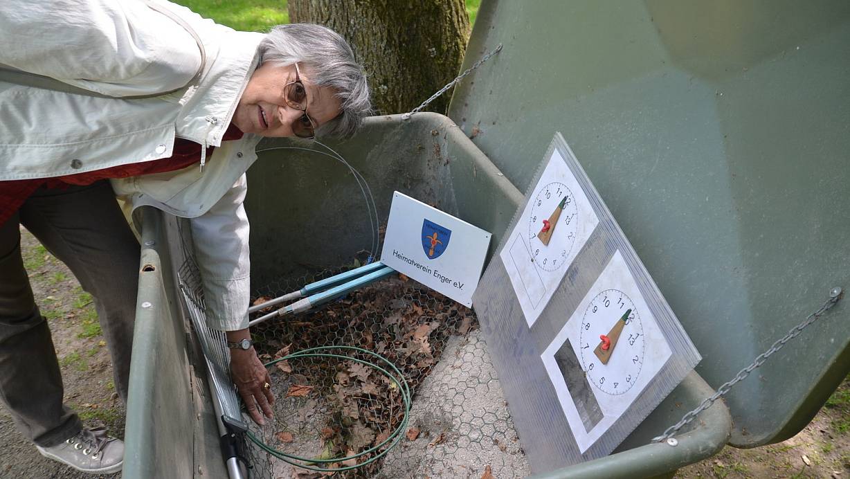 Inge Walkenhorst schaut in die Kiste, aus der Unbekannte die Boulekugeln entwendet haben. Ganz zuunterst lagert darin eine Schicht Splitt, darüber ist ein Drahtgeflecht gespannt, auf dem die Boule-Utensilien liegen. Dieses Drahtgeflecht haben die Diebe durch eine Öffnung unten in der Kiste durchtrennt und die Kugeln herausgeangelt. | © Mareike Patock