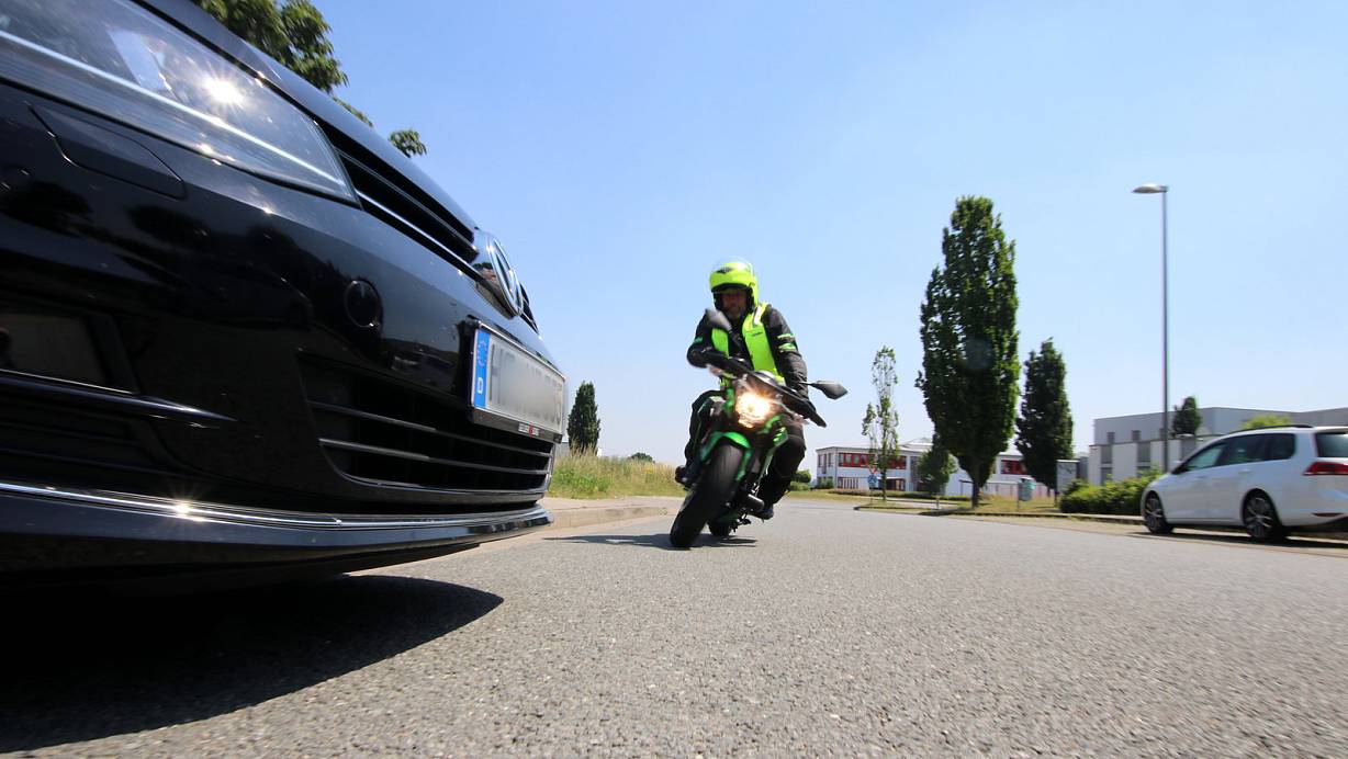 In dieser - gestellten - Situation weicht das Motorrad einem Auto gerade noch so aus. | © Andreas Sundermeier