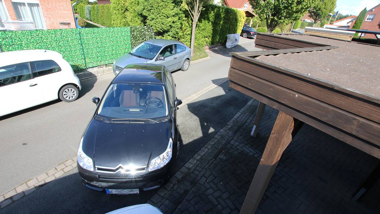 Zu eng zum Ausparken sei die verbleibende Breite der Straße, wenn - wie hier das graue Auto - Fahrzeuge gegenüber des Carports parken. | © Andreas Sundermeier