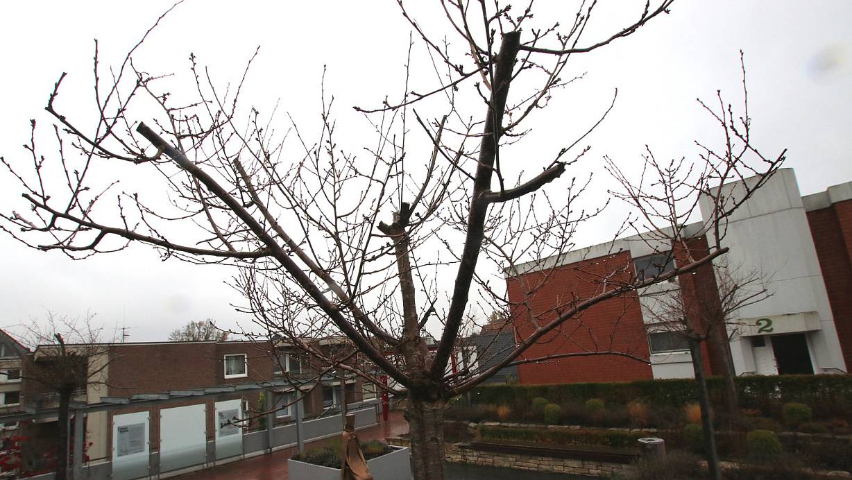 Vier Kirschbäume umgeben die Plastik der Königin-Mathilde in Enger. Sie haben in den vergangenen zwei extremen Sommern noch mehr gelitten als die anderen Bäume der Stadt. Auch sie stehen für die These: "Abwarten, was auch ihnen wird." | © Andreas Sundermeier