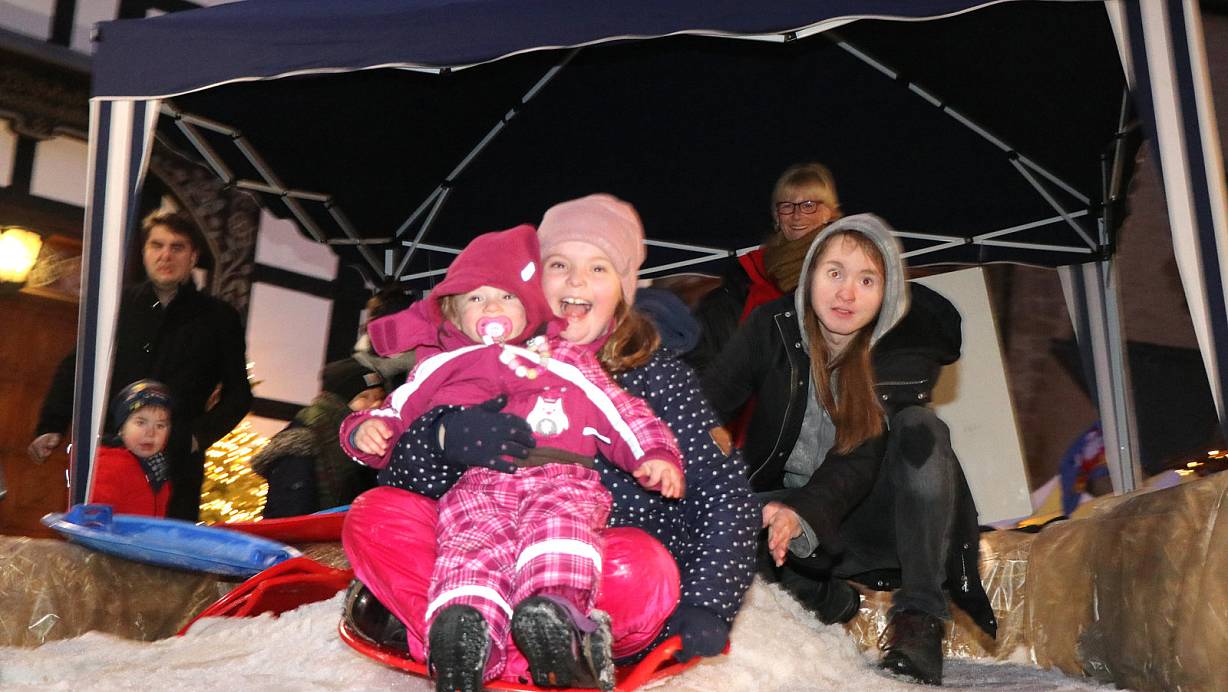 Immer wieder: Finia und ihre kleine Schwester Leonie waren mit die ersten auf der Rodelbahn. Bei Preisen von 10 Cent pro Fahrt durften sie -zigmal den Hang hinuntersausen. | © Andreas Sundermeier