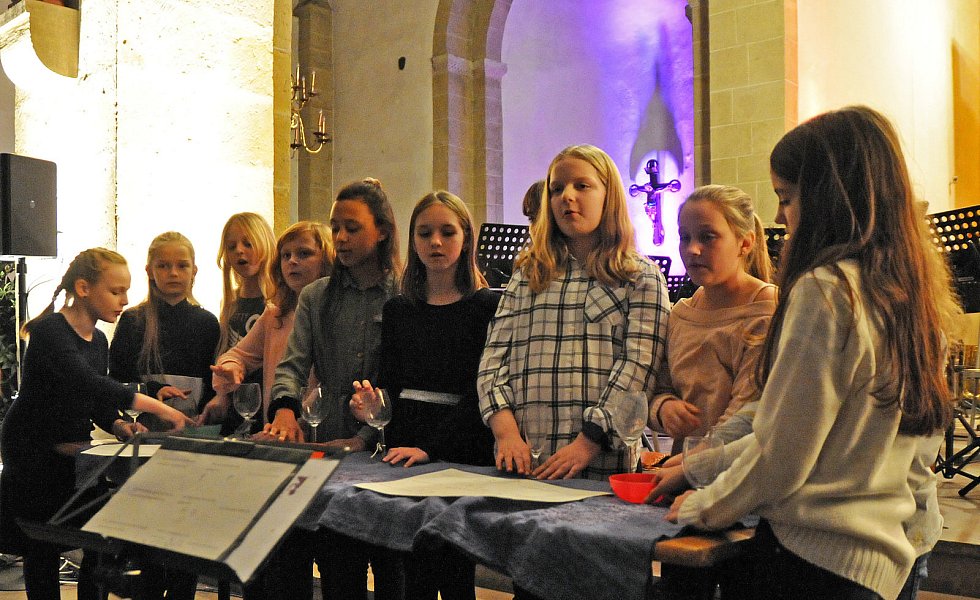 Und dann gab es noch die Darbietungen eigentlich bekannter weihnachtlicher Lieder, jedoch neu interpretiert und präsentiert. So sang etwa die Chorklasse das alte Sternsingerlied „Es ist für uns eine Zeit angekommen", jedoch nicht schwungvoll, sondern leise, zurückhaltend, immer wieder von Pausen unterbrochen, in denen die Kinder Gläsern vielfältige Töne entlockten.
