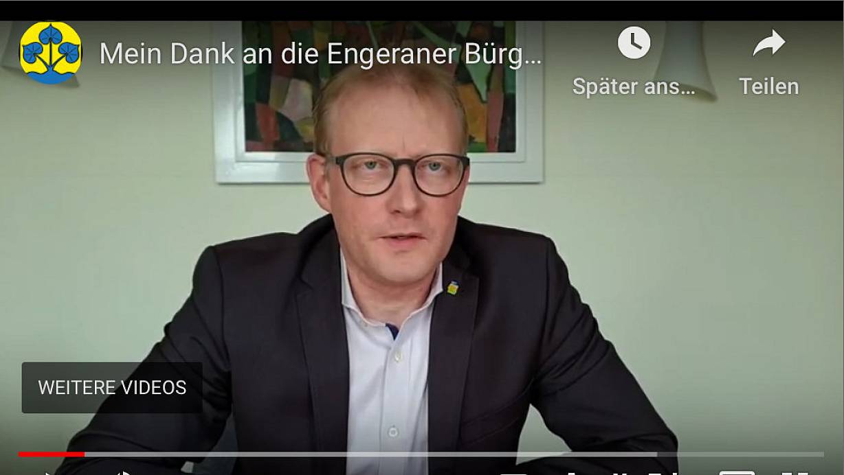 Enger Bürgermeister Thomas Meyer sagt per Video-Botschaft "Danke" und weist auf einen neue Internet-Plattform für die Gewerbetreibenden der Stadt auf der Seite "enger.de" hin. | © Andreas Sundermeier
