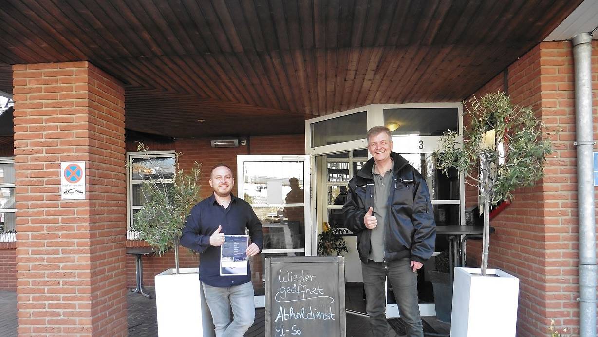 Martin Heuschkel (r.) hat Gastwirt Dimitrios Papadakis vom Restaurant "Ambrosia" einen Verkaufstresen am Eingang aufgebaut, so dass der Wirt jetzt einen Abholservice anbieten kann. | © privat
